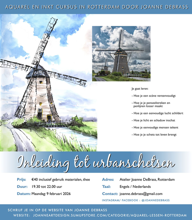 In deze workshop leer je snel en eenvoudig tekenen met pen en aquarel. Dit is een stijl die je kunt gebruiken om buiten en overal te schetsen. De wereld zal jouw tekeninspiratie worden!